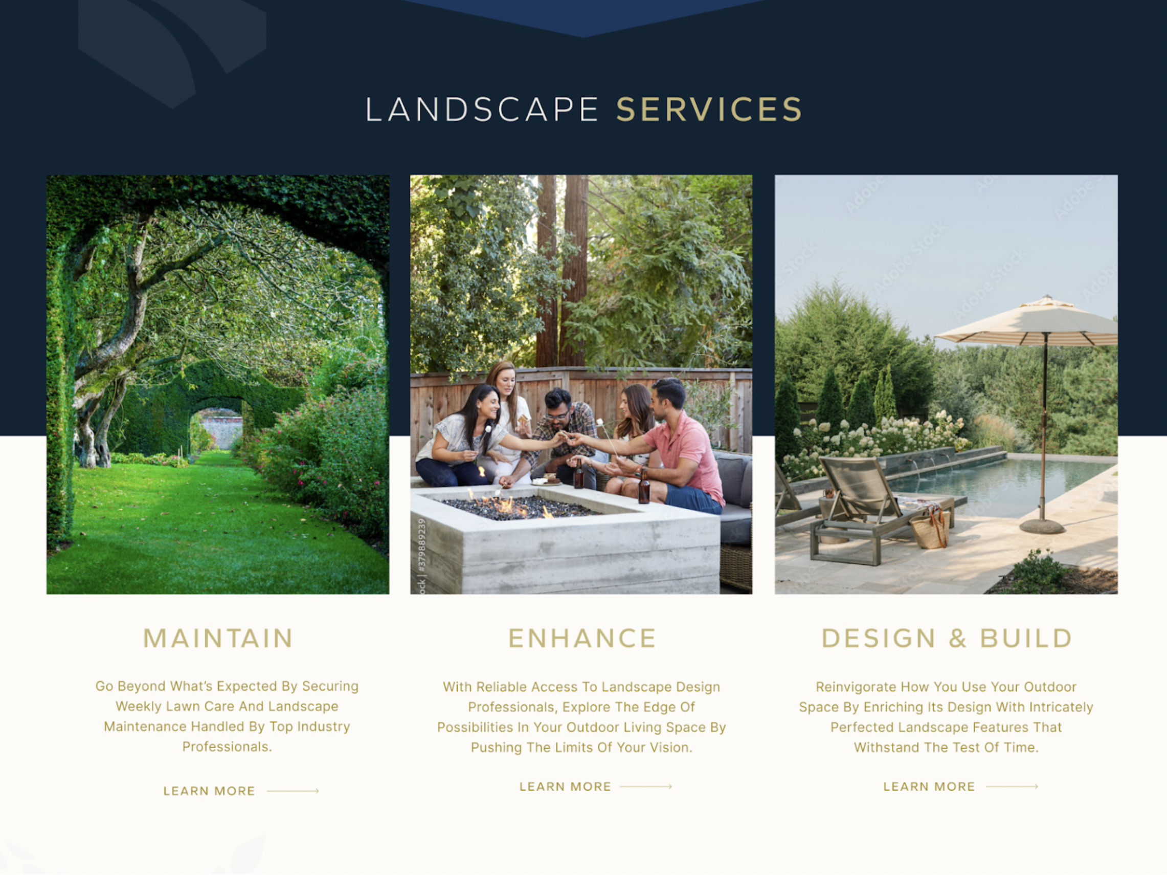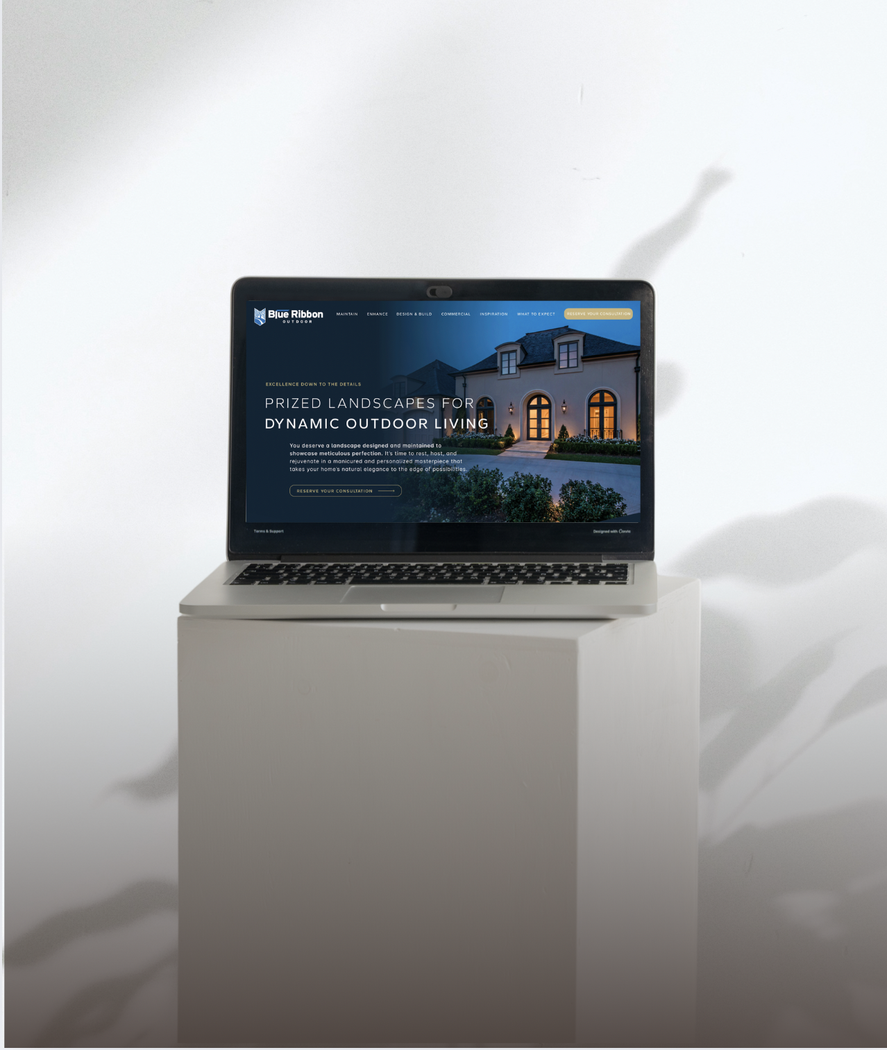 Blue Ribbon Outdoor is a full-service landscaping company in Northwest Arkansas specializing in high-end residential and commercial projects. The goal of their new website was to shift focus toward long-term maintenance contracts while maintaining a strong presence for their design and build services. The design needed to feel modern, customer-focused, and luxurious — a visual reflection of their reputation for craftsmanship and quality.